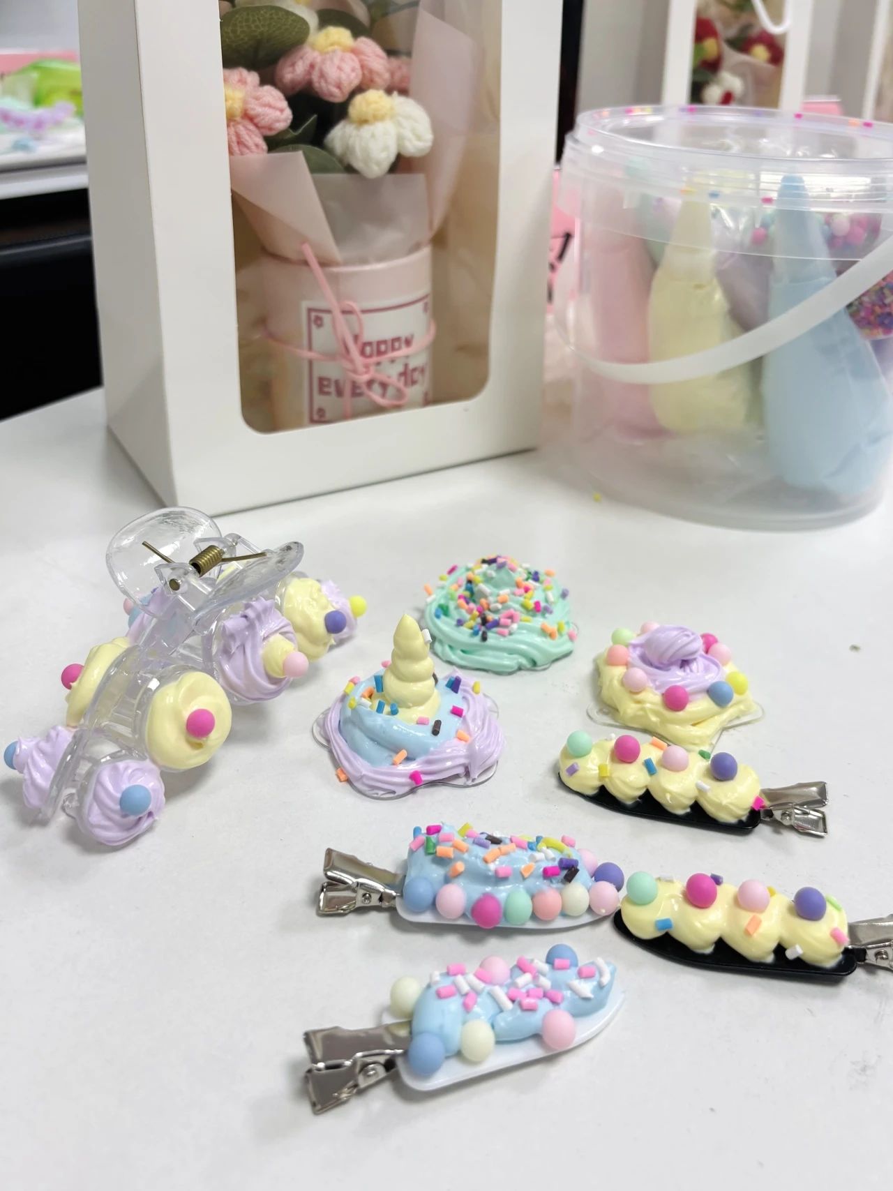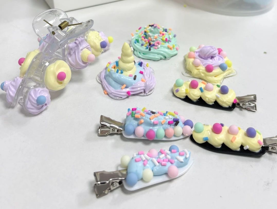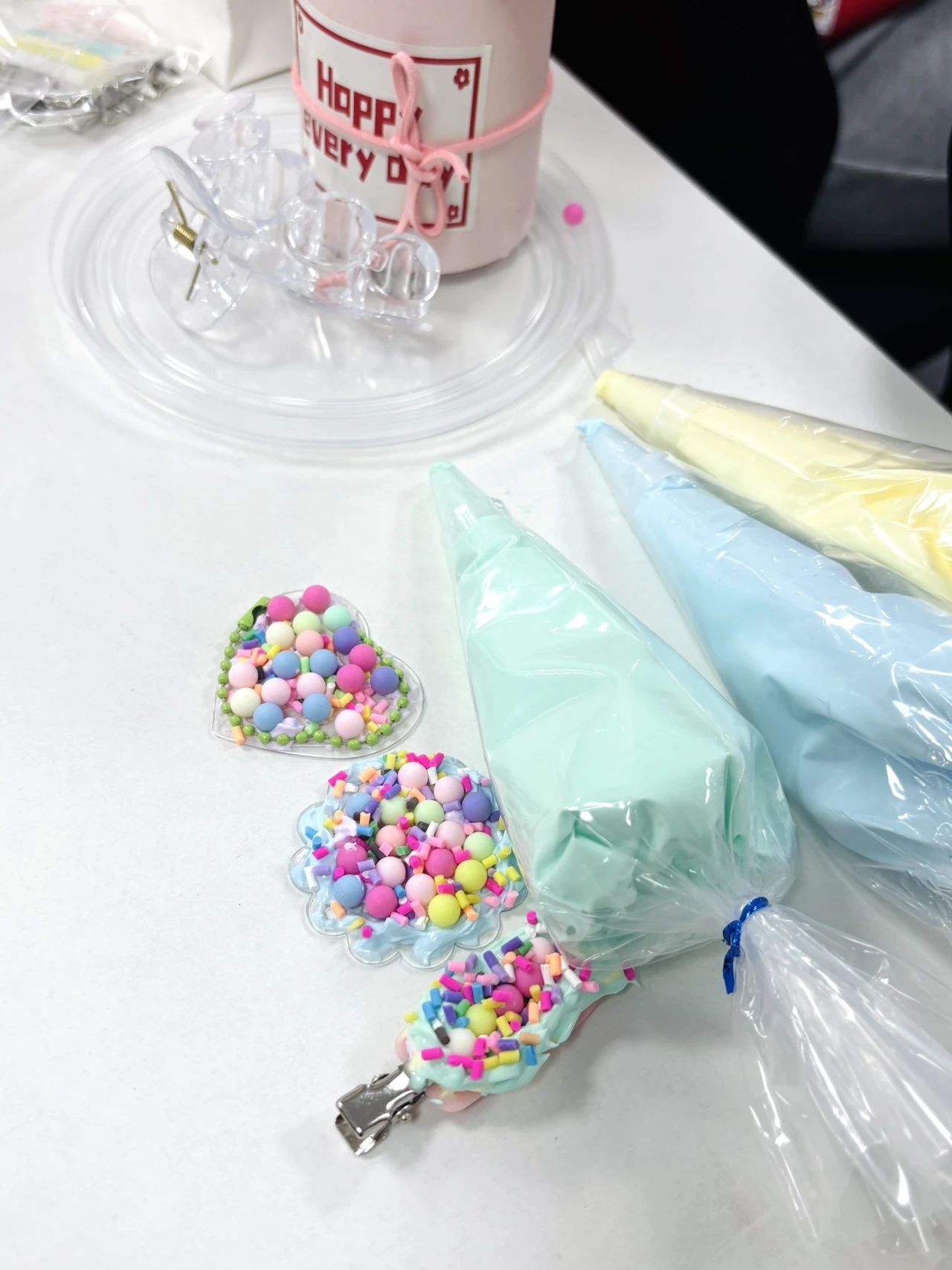 活動現場化身為夢幻手作樂園:挺進總部會議室內的長桌上,堆滿糖果色奶油膠與裝飾等元素。大家從擠膠、塑形到點綴裝飾,全情投入創作——有人將發夾捏成甜甜圈的甜蜜形狀,也有人用星空元素打造銀河系耳畔的浪漫。挺進的參與女性員工笑稱這場活動是"成年人的過家家"。